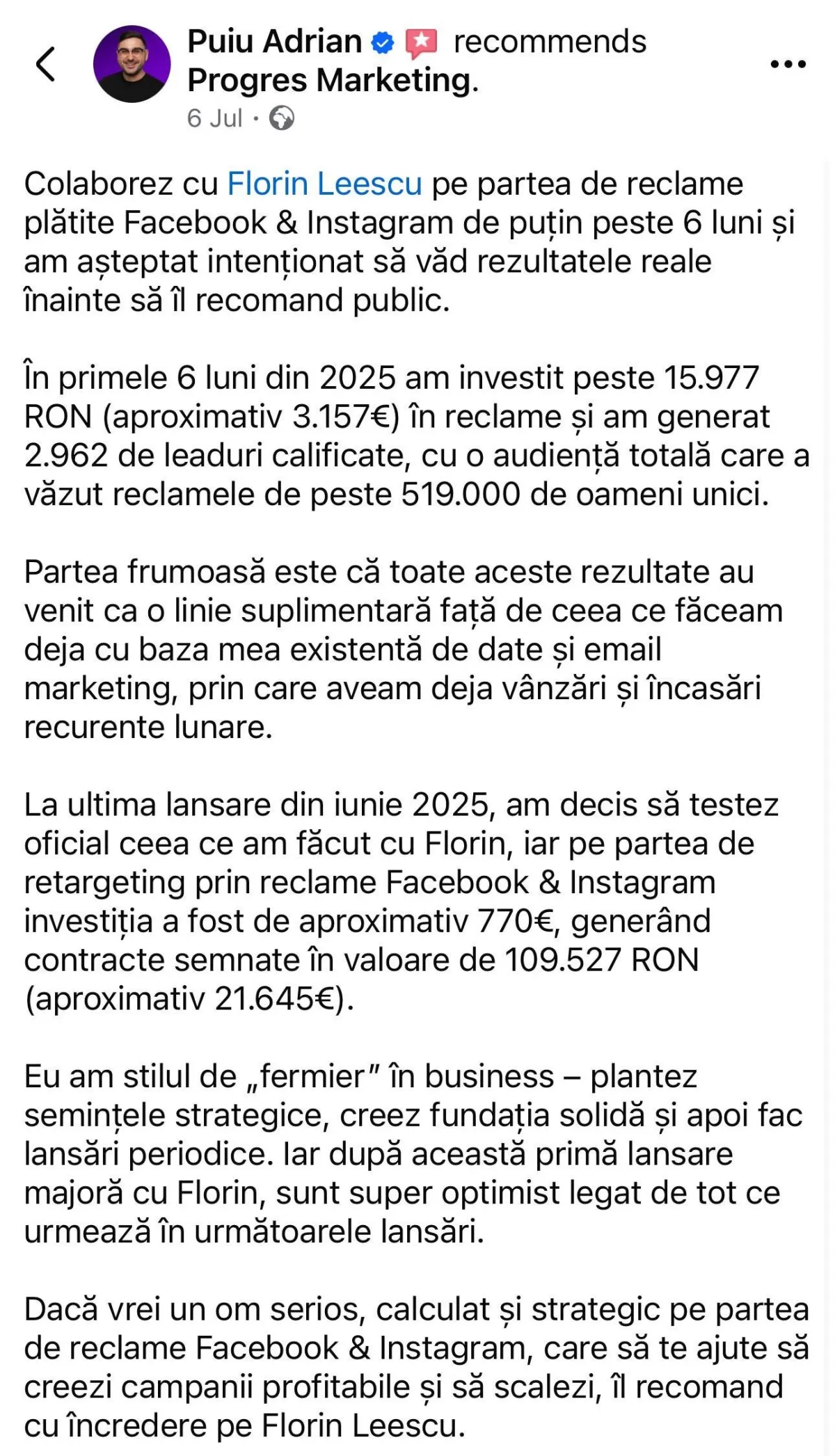 Pentru că timpul tău e valoros și pentru că ai nevoie de o strategie, nu doar de reclame la întâmplare. Noi combinăm expertiza, instrumentele potrivite și testarea continuă pentru a-ți aduce clienți, în timp ce tu te concentrezi pe creșterea afacerii.